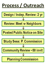 Neighbors and the Planning Commission rightfully care about the quality, type, and size of projects being constructed so that the natural beauty and character of the community is preserved or enhanced. We believed that actively involving the community in project development is essential. For our project, prior to have something for review, we spent almost two years (part-time) developing our project concept, drafting numerous floor plans, building detailed models of the home and site, and completing several independent design reviews. Next we met with our immediate neighbors to review our proposed design and seek their guidance for how we might improve it – and were able to accommodate several helpful suggestions for our project. We posted public notice on the property that we were seeking a site development permit. We held an informal study session with the city Planning Commission, where we brought our models, large renderings of the site with and without the proposed project, large scale elevation drawings of the home design, and detailed handouts of project specifications. Our immediate neighbors graciously participated in the meeting and indicated support for our project. After incorporating comments received at this meeting, we invited all neighbors within 300 feet of our property, about 50 in total to a review our project, where all the materials from the Study Session were available, at the local community center, and old firehouse, conveniently at the bottom of our street. We received a written letter of support from virtually every neighbor on street, and when we formally presented the project to the Planning Commission was unanimously approved. While several of the meetings, models, and drawings were discretionary and expensive, we believe this is a very worthwhile investment to develop a better project and inform stakeholders of the intended project approach.